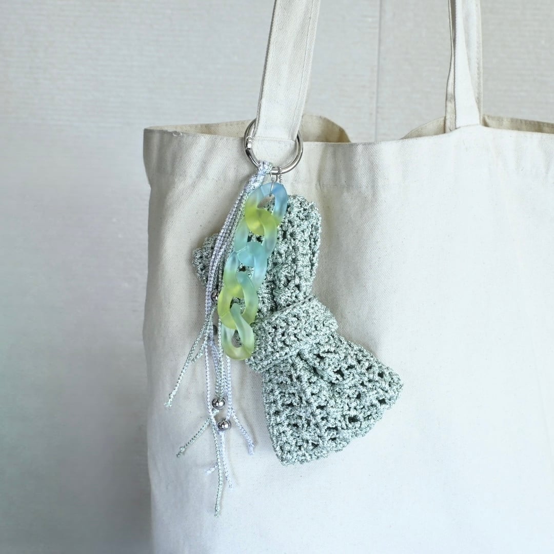 リボン型の手編みポーチとなっており、ポーチとしてはもちろんバッグチャームとしてもお使いいただけます。シルバー、ラズベリー、ミントの3色展開。